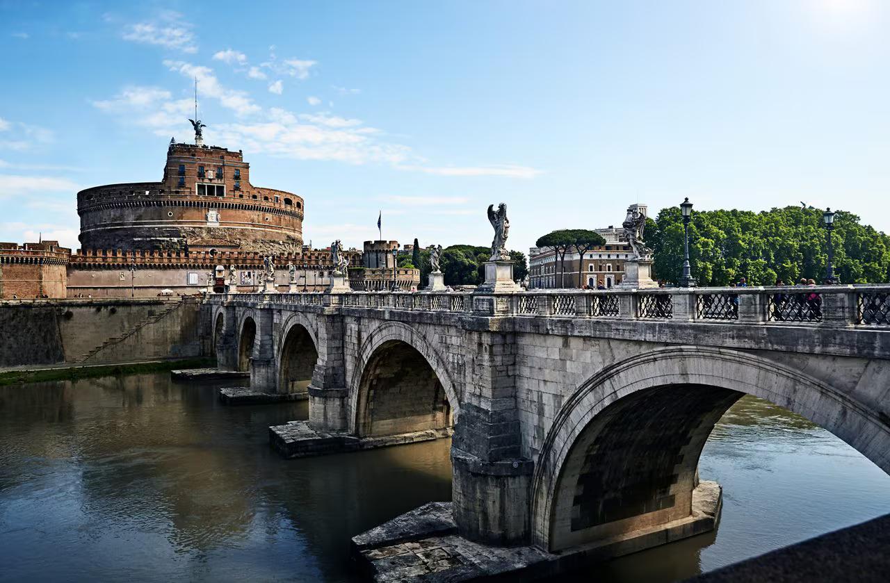 ローマのサンタンジェロ城と象徴的な天使の橋が織りなす絵画の ように美しい景色。