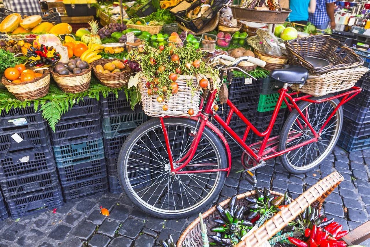 果物と野菜が入ったミルククレートにもたれかかる、バスケット付きの赤い自転車。