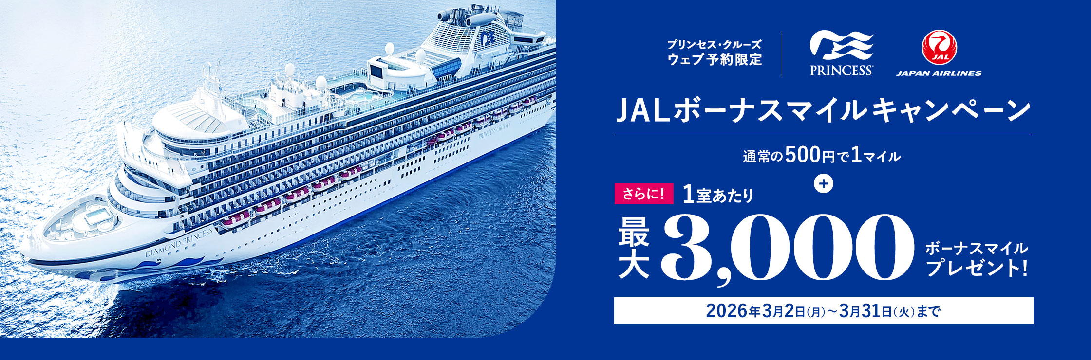 - ※適用期間終了後のご予約(予約者名/出発日/乗船地(区間クルーズの場合)/客室カテゴリー/料金プラン等)の変更は、特典の対象外となります。